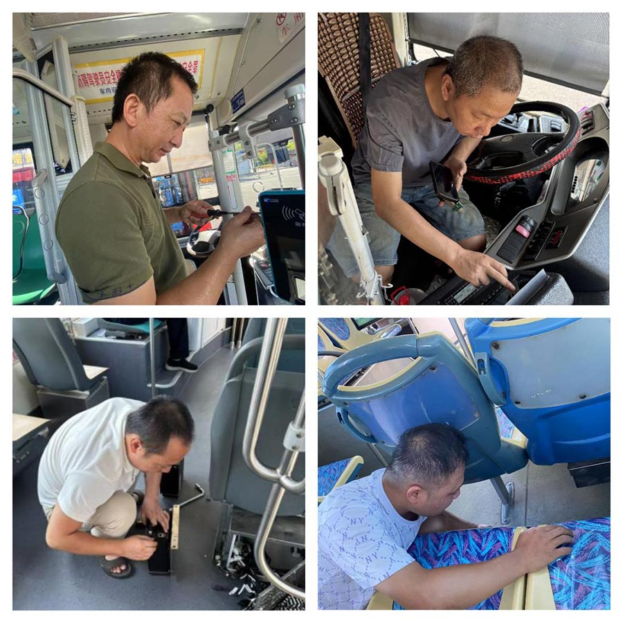 車(chē)載機(jī)在高溫下頻頻"罷工",他們俯身于悶熱的設(shè)備艙內(nèi),指尖熟練地調(diào)試線路,更換模塊,確保每一臺(tái)機(jī)器精準(zhǔn)運(yùn)轉(zhuǎn);GPS主機(jī)在烈日暴曬下信號(hào)不穩(wěn),他們頂著滾燙的金屬外殼,細(xì)致排查故障,保障車(chē)輛調(diào)度分毫不差;票箱因高溫卡滯,他們耐心拆解清理,讓每一枚硬幣、每一張錢(qián)幣順暢通行。