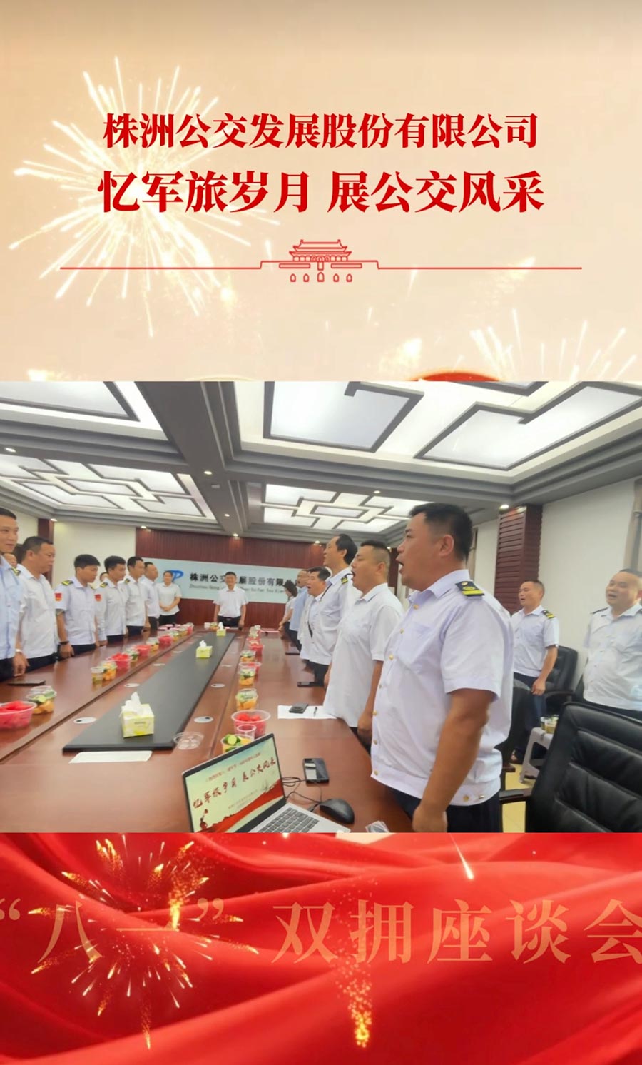 8月1日,公交發(fā)展公司開展"憶軍旅歲月 展公交風(fēng)采"雙擁座談會(huì)。公司黨總支書記、董事長(zhǎng)朱建新,黨總支副書記、工會(huì)主席王瑩,副總經(jīng)理唐偉以及30名退役軍人參加座談會(huì)。