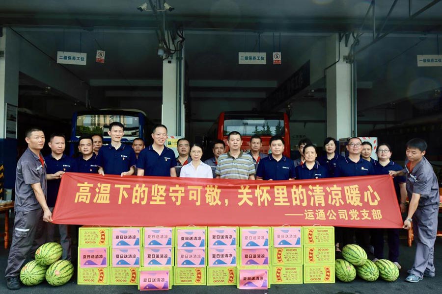 烈日炎炎,熱浪滾滾。近期,集團(tuán)黨委副書記、工會主席陳小玲,集團(tuán)副總經(jīng)理黃治峰與運通公司領(lǐng)導(dǎo)班子一行來到運通公司維修車間,為堅守在崗位上的一線修理工送去西瓜、王老吉等防暑降溫物資,將集團(tuán)的關(guān)懷與敬意傳遞到每一位員工心中。
