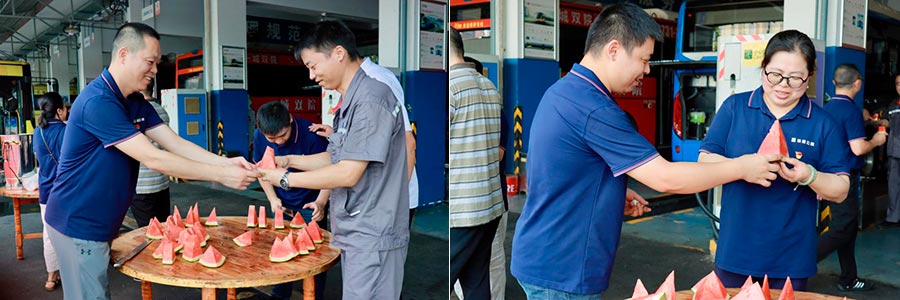 各位領(lǐng)導(dǎo)與修理工們親切交談,詳細(xì)詢問高溫作業(yè)下的防暑保障措施落實情況。他們反復(fù)叮囑大家,要合理安排工時,勞逸結(jié)合,時刻把身體健康和作業(yè)安全放在首位。隨后,領(lǐng)導(dǎo)們親手將清涼的西瓜和暖胃的綠豆粥送到員工手中,一句句關(guān)切的話語、一份份貼心的物資,驅(qū)散了夏日的燥熱,讓大家倍感溫暖。