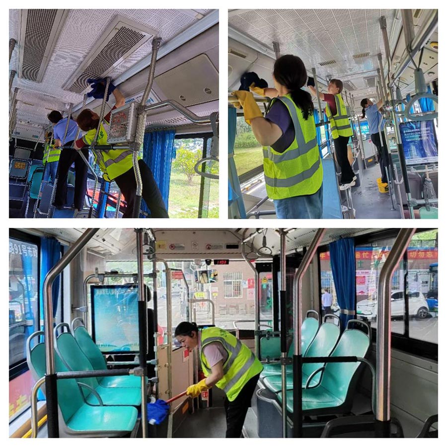 正午時(shí)分,太陽最烈。公交車到站后,保潔員們只有短短幾分鐘:趁乘客下車的間隙,沖上車,快速清掃垃圾、擦拭扶手。車廂里的熱浪裹著尾氣味撲面而來,剛掃完一輛車,口罩里就全是汗水,每拖一下地面,汗水順著臉頰滴落,與拖布留下的水漬混在一起。"一天喝七八瓶水,每打掃完一趟車,衣服能擰出小半桶水。"她們打趣道。但看到乘客坐上干凈的座位,笑著說"這車真清爽",她們就覺得值。