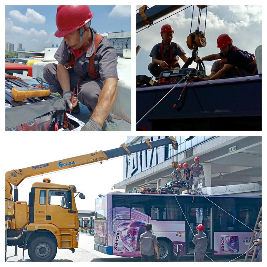 與此同時(shí),在運(yùn)通公司荷塘修理廠,一場與高溫的較量正激烈上演。維修師傅們面對(duì)著電池艙內(nèi)高達(dá)六七十度的熱浪,金屬灼燒感撲面而來。他們戴著絕緣手套,手掌被燙得發(fā)紅,仍精準(zhǔn)拆卸著因高溫變得更緊固的螺栓。汗水順著臉頰滑落,滴在車頂瞬間蒸發(fā),工服早已被浸透,析出的鹽霜如同"鎧甲"。面對(duì)該廠區(qū)首次動(dòng)力電池吊裝作業(yè)的無經(jīng)驗(yàn)挑戰(zhàn),大家分工明確、默契協(xié)作,在確保安全的前提下摸索操作流程。經(jīng)過全員1小時(shí)的緊密配合,動(dòng)力電池終于平穩(wěn)落地。