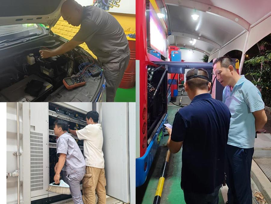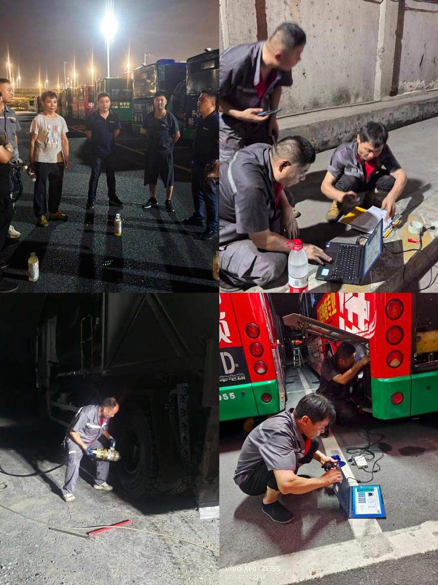 深夜來臨,多數(shù)人已在空調(diào)房安睡,維修師傅們?nèi)栽趷灍嶂懈┥砉?,開展動力電池專項檢測與拆裝,汗水浸透工裝、油污沾滿雙手仍精準(zhǔn)操作,為公交車筑牢安全屏障。面對外部任務(wù),國信公司設(shè)備故障,他們連夜趕往現(xiàn)場排查修復(fù);工程車急需換胎,他們火速到場保障施工;湖南工業(yè)大學(xué)箱變充電柜突發(fā)故障,他們及時處置恢復(fù)供電;北汽銀建公司的新能源車控制器搶修等,高效響應(yīng)各類搶修需求。
